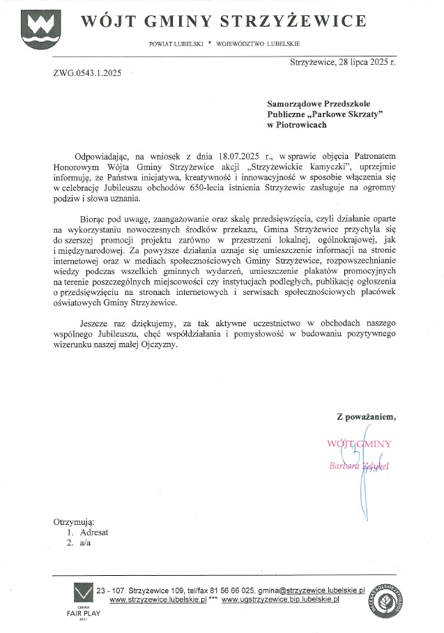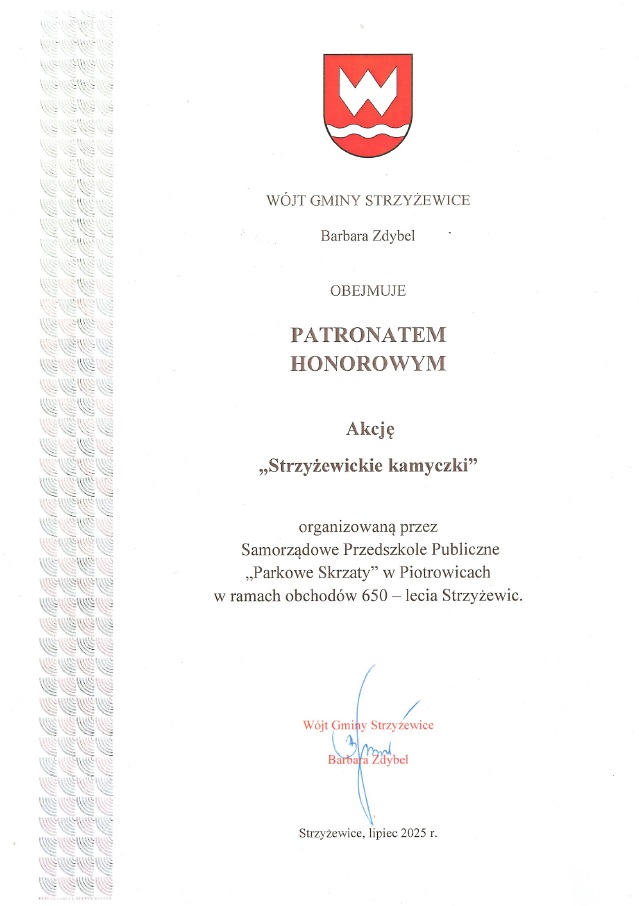 Jest nam niezmiernie miło poinformować, że nasza akcja została objęta Patronatem Honorowym Wójta Gminy Strzyżewice . Jesteśmy przekonani, że otrzymane wsparcie będzie miało nieoceniony wpływ na sukces naszego przedsięwzięcia oraz przyczyni się do zwiększenia jego rangi i widoczności w środowisku lokalnym. Tym samym sprawi, że radość, symbolika i historia tej ziemi mogą wraz z kamyczkami dotrzeć do różnych regionów naszego kraju, a także poza jego granice.