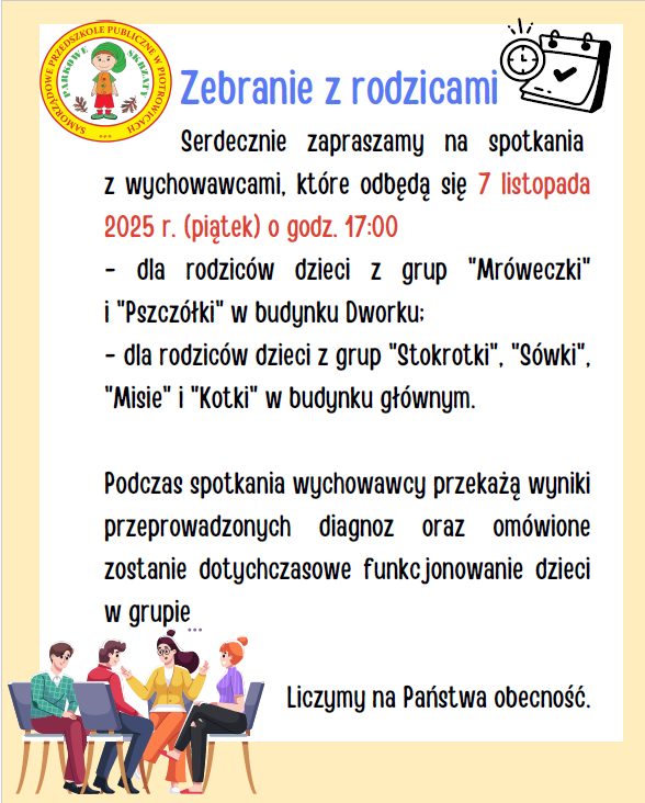 Zebranie z rodzicami 28 Paź 2025, WtoData publikacji, 28 Paź 2025, Wto, Katarzyna TuzimskaAutor, Katarzyna Tuzimska, 16Ilość wyświetleń, 16